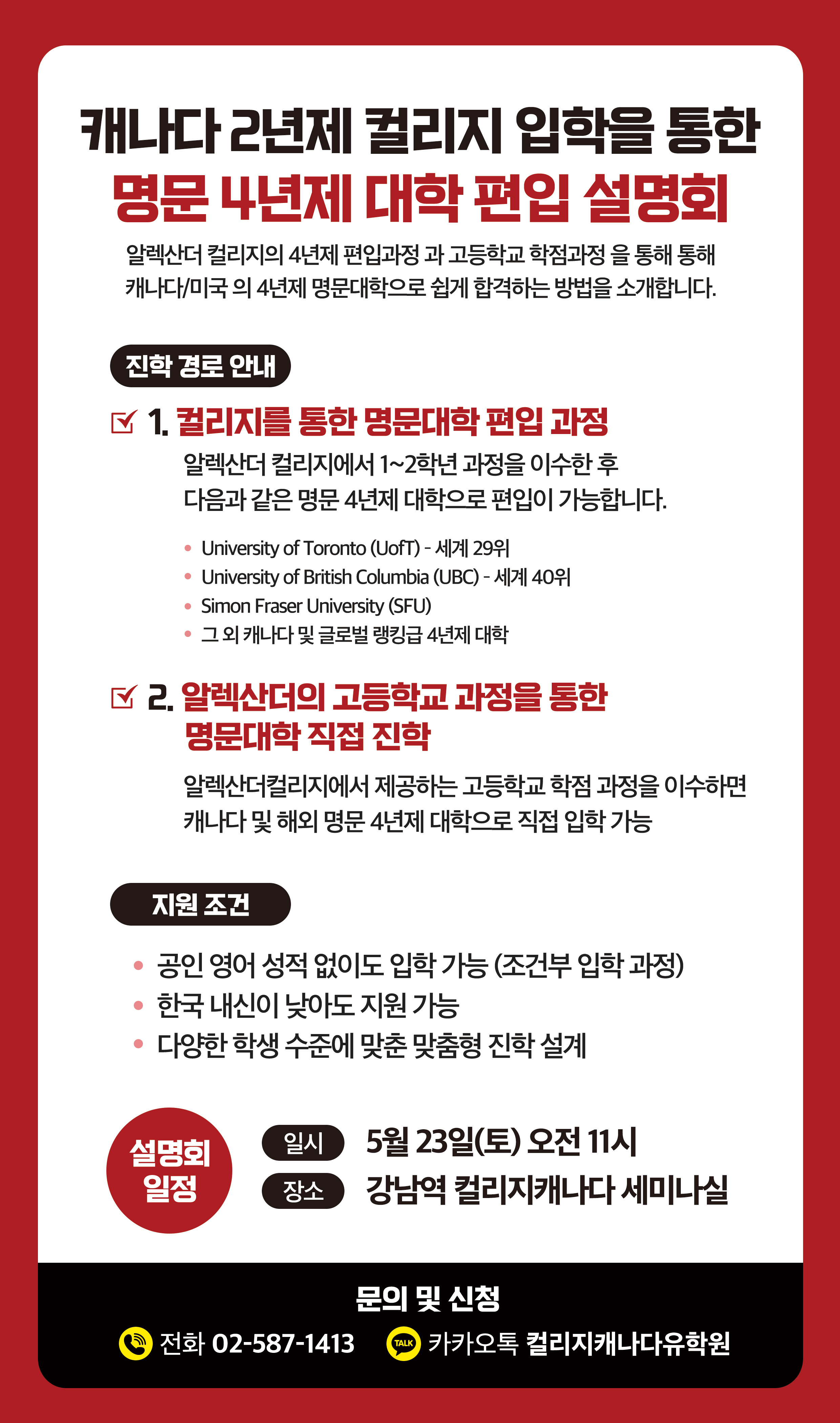 캐나다 대학 조건부 입학, 학부 입학수속, 대학부설 ESL, 유학후 이민, 자녀무상교육 등 대학입학 관련 수속만을 전문으로 하는 국내유일의 캐나다 대학 수속 전문 유학원 입니다.